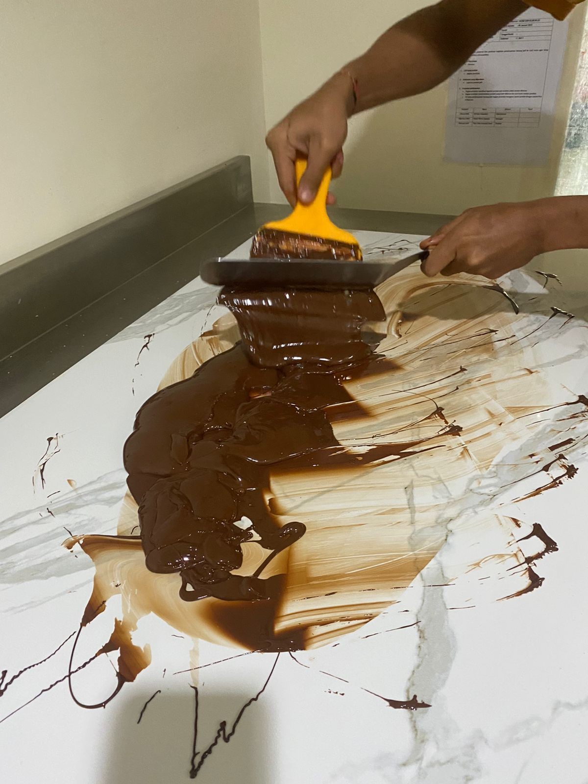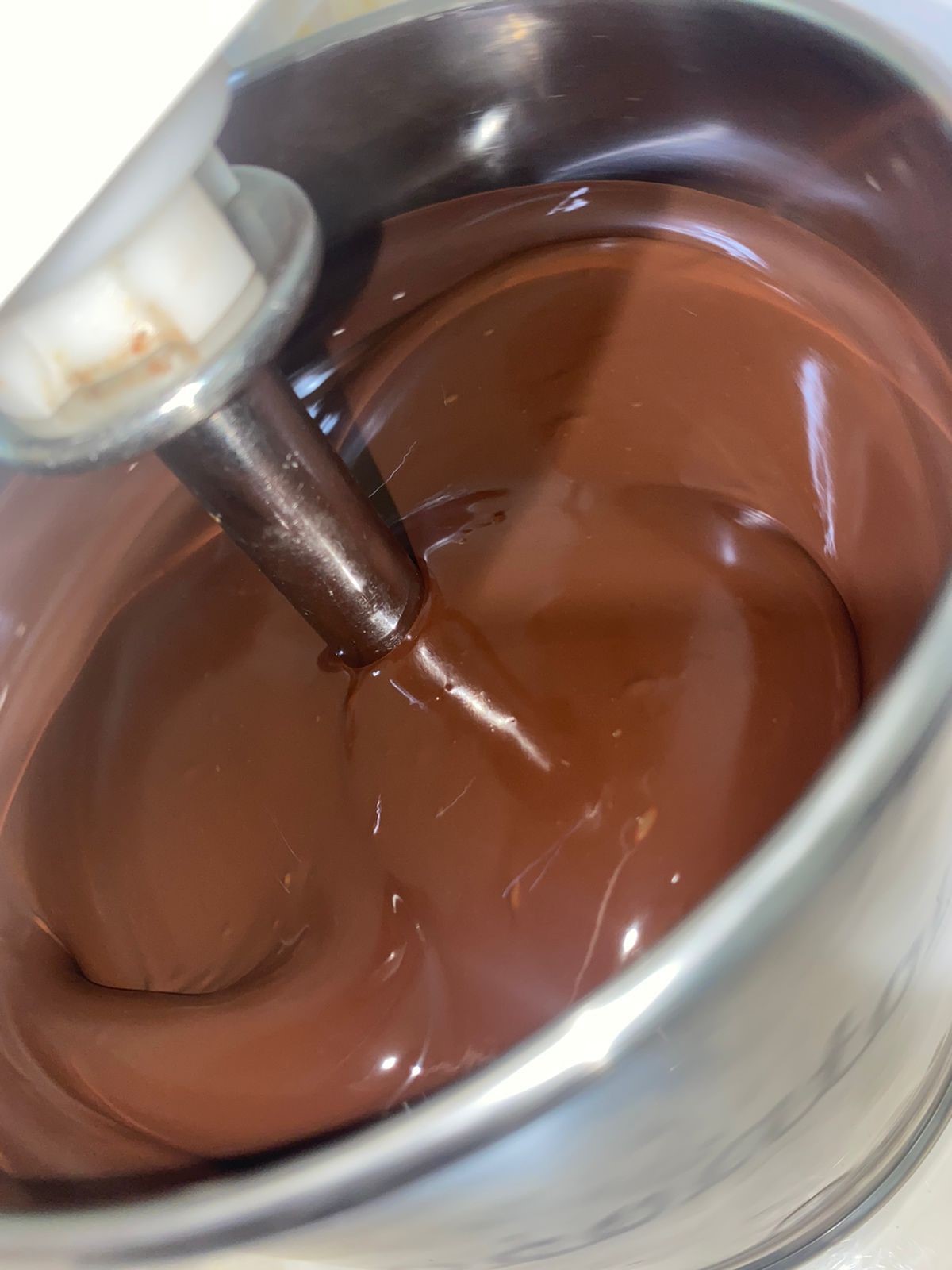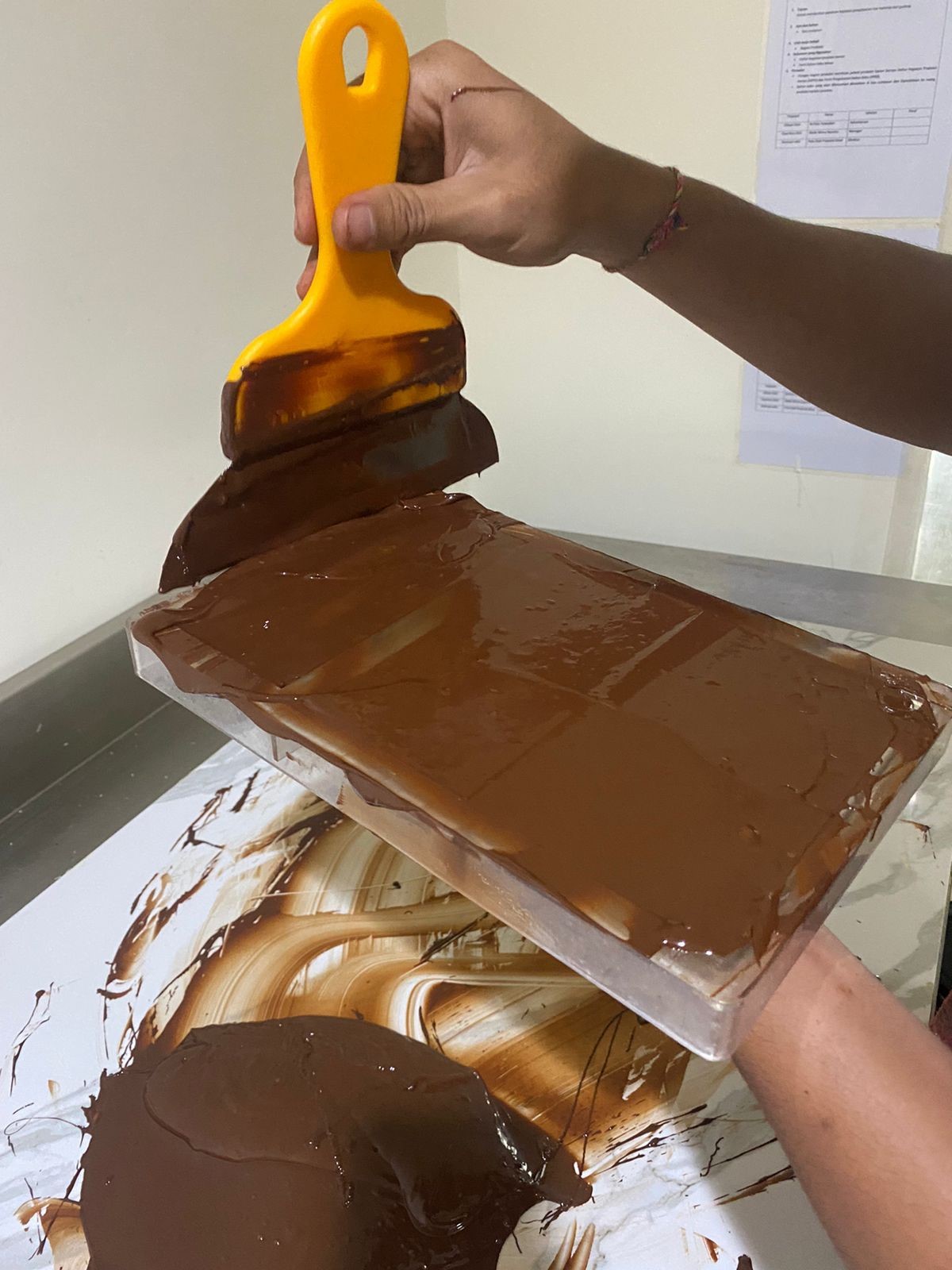 The hot chocolate liquor is then cooled to the right process and temperature to melt the cocoa butter crystals to the right level. This makes the chocolate shine well and melt well when it goes into your mouth and not at room temperature.